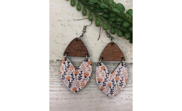 These earrings are a teardrop shaped two-part dangle earring. The top is laser cut from maple and stained with beautiful mahogany stain. The lower section is finished in a cream and yellow floral pattern. This lightweight set is sure to add to any spring/summer wardrobe. Contains a nickel free fishhook ear wire.
