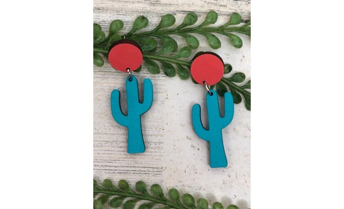This cute cactus earring is a two-part dangle design. These are cut from a lightweight wood and hand painted to add the pops of color. They come in coral top/blue cactus and pink top/green cactus. This set is finished with a nickel free post back.