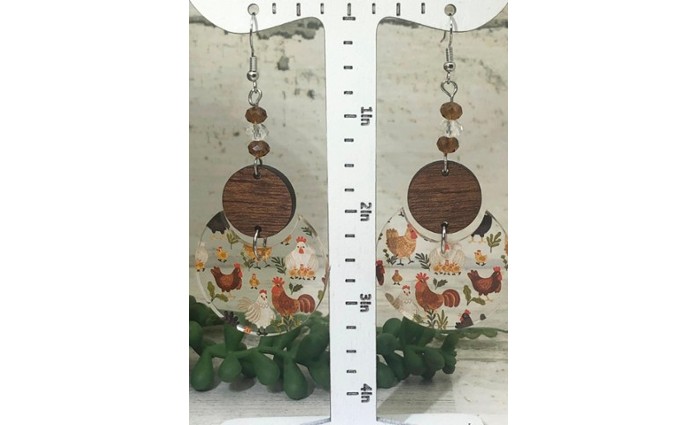 This two-part dangle with beads is made up of brown and clear beads, lightweight wood, and a clear acrylic with a fun chicken print. These would make a cute gift for that chicken loving friend in your life. The lightweight materials and fun style make this set easy to wear while out feeding the chickens or running errands. They are finished with a nickel free fishhook ear wire.